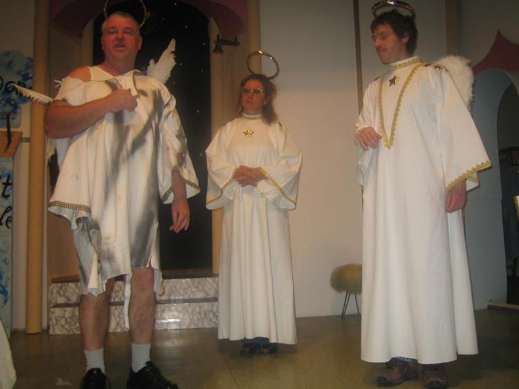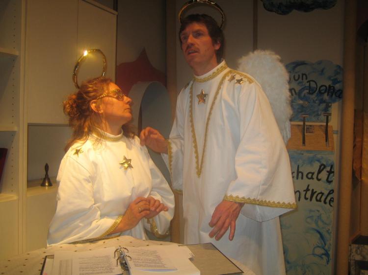 Auch im Himmel ist alles nicht ganz so „himmlisch“, wie man es sich im Allgemeinen vorstellt. Auch dort treffen die unterschiedlichsten Charaktere zusammen, darum menschelt es in den Wolkengefilden ganz gehörig. Ein etwas überspannter Engel namens Gabrielus ist sehr darum bemüht, den bayerischen Flegeln etwas himmlische Zucht und Ordnung beizubringen, jedoch vergeblich. Die paradiesische Hausordnung interessiert doch einen g‘standenen Bayern schon gleich gar nicht. Als dann noch der Urbayer Pankratius, den ein irdisches Schwammerlessen dahingerafft hat, samt Tuba und Schafkopfkarten auftaucht, ist es mit dem himmlischen Frieden vorbei. Er beschließt den himmlischen Bewohnern das bayerische Kulturgut näherzubringen. Sein friedvolles Dasein wird jedoch jäh beendet, als seine Gattin auftaucht. Auch sie hatte von den Schwammerln gegessen, jedoch durch ihre robuste Statur den Weg zum Himmel etwas später angetreten. Eine ausgewachsene himmlische Palastrevolution bahnt sich an.
